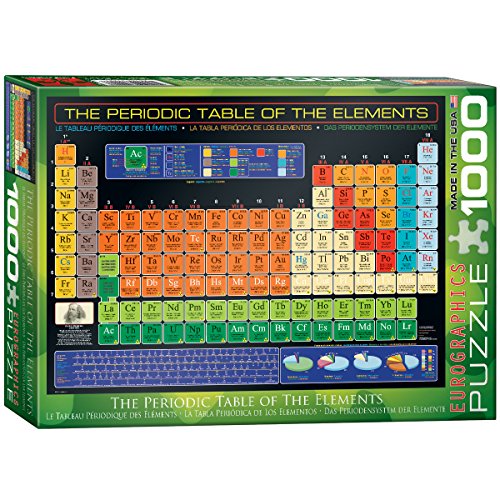 EuroGraphics Periodic Table of Elements 1000-Piece Puzzle. Box size: 10" x 14" x 2.37". Finished Size: 19.25" x 26.5". Contains the name, symbol, atomic number, atomic weight and electronic configuration of each element. This cornerstone of the academic discipline of chemistry has found wide application in physics, biology, engineering and industry. Strong high-quality puzzle pieces. Made from recycled board and printed with vegetable based ink. This superior quality puzzle will delight and educate all at the same time.