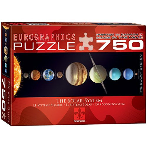 EuroGraphics Solar System Jigsaw Puzzle (Panorama) 750-Piece Puzzle. Box size: 10" x 14" x 2.37". Finished Size: 36" x 12". Based on satellite photography this puzzle illustrates all 8 planets of the solar system - plus dwarf planet Pluto. Strong high-quality puzzle pieces. Made from recycled board and printed with vegetable based ink. This superior quality puzzle will delight and educate all at the same time.