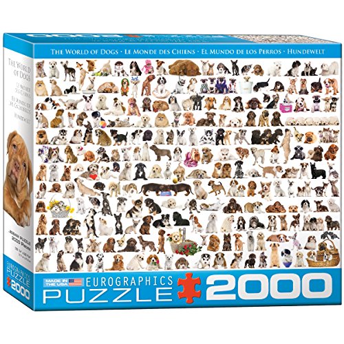 EuroGraphics The World of Dogs 2000-Piece Puzzle. Box size: 12" x 10" Puzzle Dimensions: 38.25" x 26.63" A delightful collection of the various breeds of man's best friend. Strong high-quality puzzle pieces. Made from recycled board and printed with vegetable based ink. This superior quality puzzle will delight and educate all at the same time.