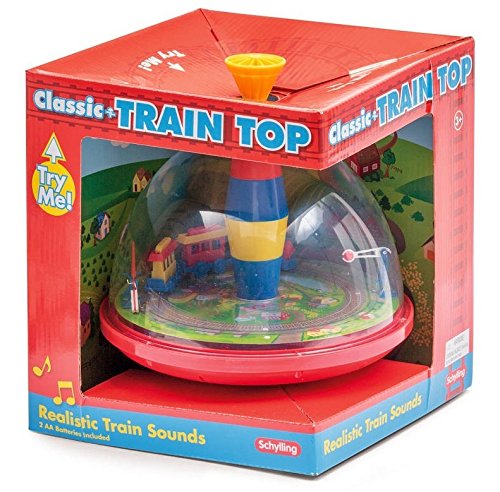 Toot! Toot! Electronic Train Top from Schylling Toys, the world's leader in traditional toys and classic fun, enhances the classic top with a moving model train and dynamic sound. Pump the handle to spin the top and watch the train roll along the tracks. Spin the top and listen to the train chugging along as the engine churns and the bells clang. Primary colors offer enjoyable entertainment for little ones. Includes 2 AA batteries. For ages 3+.