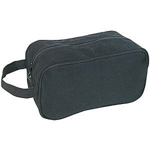 Heavy weight cotton canvas. Plastic lined. Molded zipper closure. Perfect for bringing all your personal accessories along on any business or pleasure trip. Convenient carrying handle attached to the bag for easy transport. Ever had your liquids spill in your suitcase causing damage to other goods. Well with our convenient, lightweight compartment case you wont have to worry about your shaving cream/aftershave/cologne/ or any other liquid spilling and damaging your clothing while traveling. GI Government Issued style. Black army travel kit case. Dimensions 10" x 5" x 5" (inches).