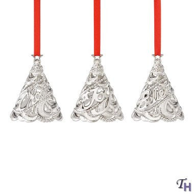 Shaped like Christmas trees, these Lenox pierced, silver-tone metal ornaments celebrate the season in their own unique way. Because each is sculpted with a special holiday greeting "Cheer", "Joy" and "Believe". Crafted of silver-plated metal. Includes red ribbons for hanging. Height: 3" Makes a perfect holiday gift.