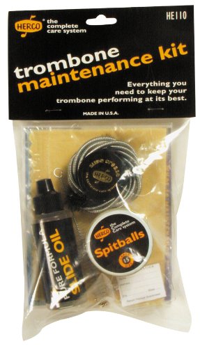 Flex Brush Cleaner, Mouthpiece Brush, Slide Grease, Spitballs Trombone Care Guide, Valve Protector, Polishing Cloth, Slide Oil, I.D. Tag.