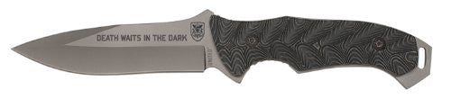 This S.O.A. Assault knife features a contoured premium Micarta handle which not only gives this knife a tactical appearance, but is also slip resistant and extremely easy to grip even while wet. The 4 3/4-Inch full-tang blade has been titanium-coated to reduce glare and prevent corrosion and then etched with the S.O.A. emblem and “Death Waits In The Dark.-Inch The extended tang of the blade can be used as a pry bar in emergency situations. Each knife includes a custom-molded Kydex sheath with a high-pressure metal clip that has been laser-etched with the S.O.A. emblem and also offers pre-drilled lanyard holes. Because the sheath is custom-molded, it prevents the knife from falling from the sheath, even while clipped upside down on a shoulder strap or rifle sling.