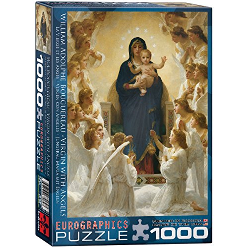 EuroGraphics Virgin with Angels by William Bouguereau 1000-Piece Puzzle. Box size: 10" x 14" x 2.37". Finished Size: 19.25" x 26.5". Bouguereau (1825-1905), being an academic painter, commented that to be a good artist you have to see color and line as the same thing. Strong high-quality puzzle pieces. Made from recycled board and printed with vegetable based ink. This superior quality puzzle will delight and educate all at the same time.