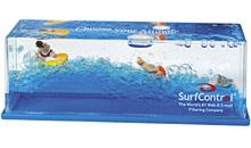 WAVE PAPERWEIGHT Gently move the liquid in the wave paperweight from side to side for a soothing experience. The motion of the waves will move the surfers around. The wave paperweight is a practical stress reliever that will add some color to your desk and brighten up your workspace.Wave Paperweight : about 6 long x 2 wide x 2 high hard plastic blue liquid two sharks.NOTE: Imprinting shown on the picture is available.