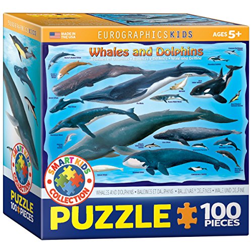 EuroGraphics Whales & Dolphins 100-Piece Puzzle. Box size: 6" x 6" x 2.37". Finished Size: 10" x 13". Kids will love playing with this educative jigsaw puzzle featuring over 20 species of whales and dolphins. Strong high-quality puzzle pieces. Made from recycled board and printed with vegetable based ink. This superior quality puzzle will delight and educate all at the same time.