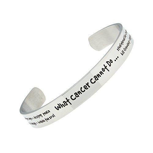 This inspiring cuff bracelet reads, "What Cancer Cannot Do: corrode faith, shatter hope, destroy peace, silence courage, invade the soul, steal eternal life, conquer the spirit, cripple love, kill friendship, suppress memories." This high quality stainless steel bracelet conveys a beautiful message that makes a touching gift to a friend or loved one battling cancer.