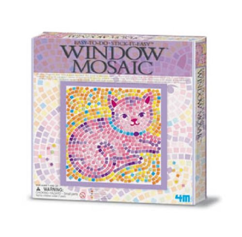 Pliable, self-attaching transparent tiles assemble into a brilliant, napping "Kitty" Window Mosaic. Non-adhesive "cling" tiles are easy to remove and reuse. Design template included. Finished mosaic is 10.25" square. Create your own Window Mosaic Art. Kit includes over 800 plastic mosaic pieces, template, transparent board, four suction cups and complete instructions. Great kit for creative minds.