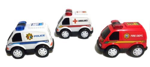 Save the day with these awesome Rescue Vehicles. These 4" long cars, feature a powerful friction wind-up motor. Just build the friction by rubbing them on a hard surface and watch them take off. Great for children 2 and up.